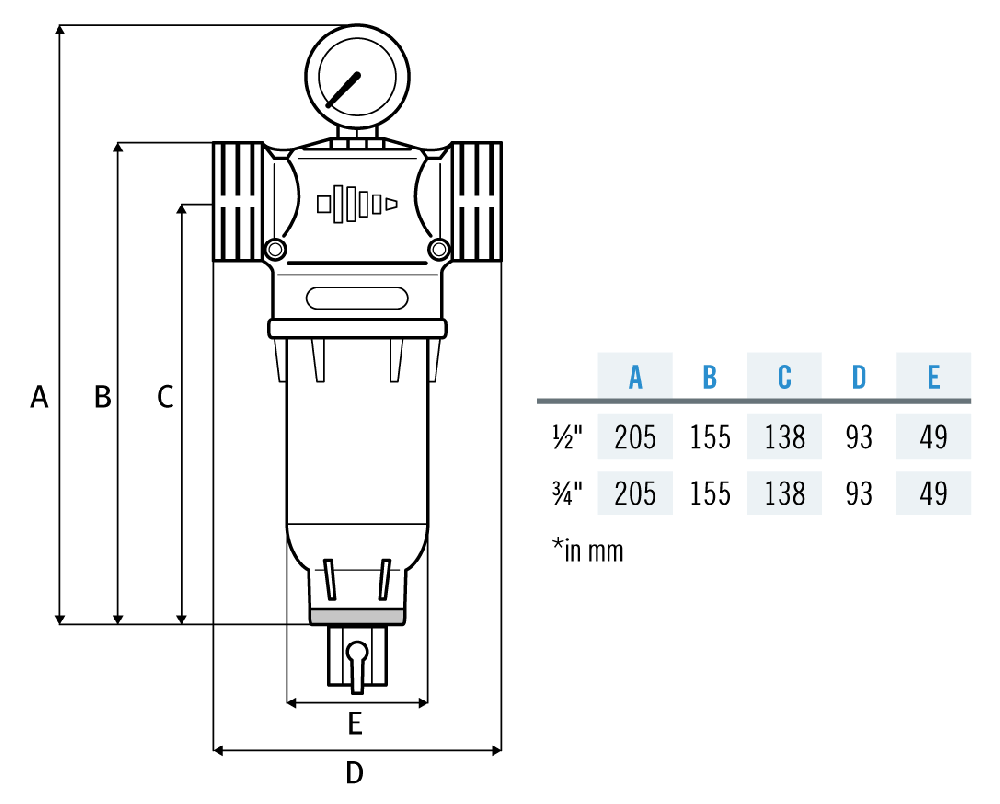 The head and tank are in reinforced polymer and demonstrate high-quality mechanical properties, such as resistance to burst and fatigue; in addition, they are more resistant to stresses and shocks. At the bottom of the filter there is a swivel fitting in 1/4 " brass, allowing easy installation of a drain valve.