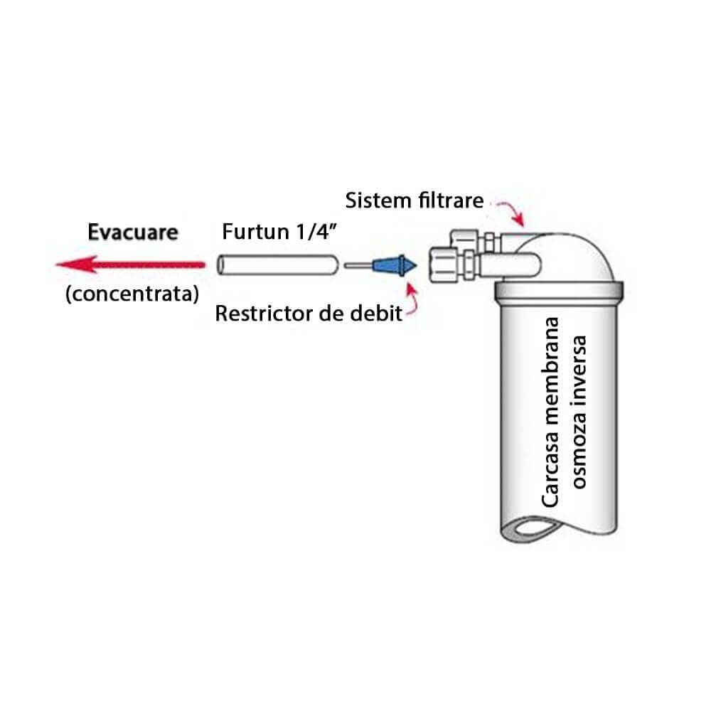 Restrictiile de debit capilar Aero se introduc cu usurinta in toate tuburile de 1/4 "OD situate pe membrana Linia de deseuri (denumita si concentrat, saramura sau clatire). Lungimea liniei capilare de control al debitului determina restrictia de debit, lungimile mai scurte permit apei sa treaca prin o rata mai mare.