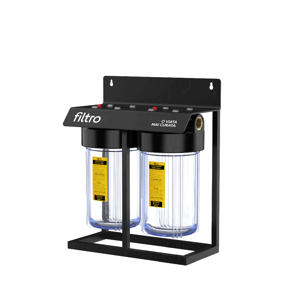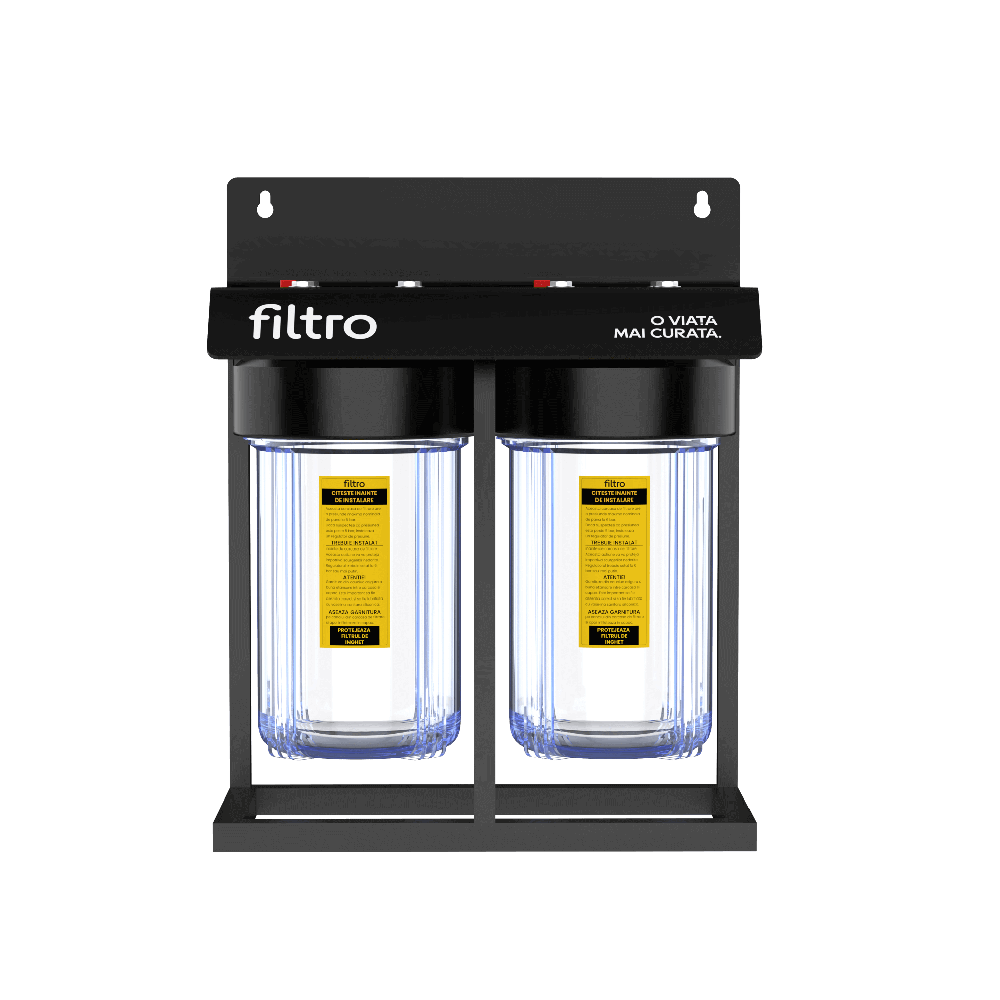 Sistemul de filtrare BIG CLEAR 10" TWIN in 2 stadii este format din 2 carcase de filtrare BIG CLEAR 10″ sustinute de un cadru metalic rezistent. Acest sistem este unul eficient, dotat cu valve de eliberare presiune pe intrare si iesire. Acest sistem de carcase va ofera o instalare usoara, fara sa fie nevoie de spargerea zidurilor sau modificarea complexa a retelei de apa. Veti amplasa sistemul acolo unde este cel mai convenabil. Daca doriti, se poate agata si in perete insa noi recomandam sa stea pe podea.